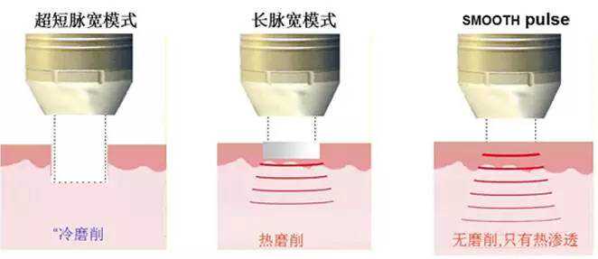 3.超长脉宽(Smooth模式)时,则只产生热作用,而没有磨削作用,可用于祛皱嫩肤。