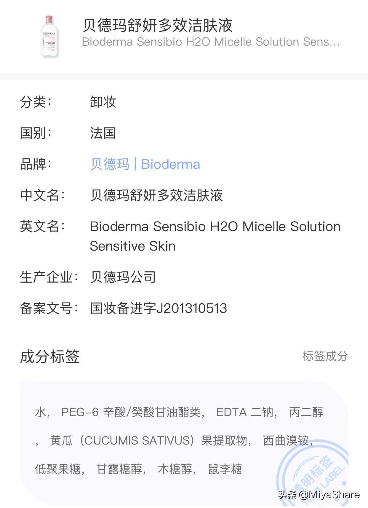 一般来说,使用一款产品出现问题或皮肤得到某种改善,咱们首先看是不是产品的作用。所以,咱们先看产品成分,贝德玛粉水全称为:贝德玛舒妍多效洁肤液,成分表如下: