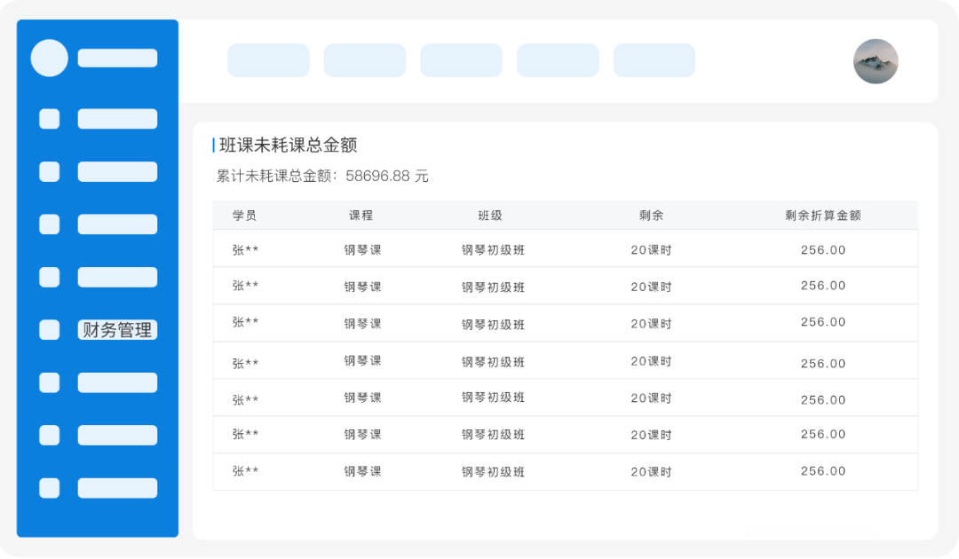“已耗课总金额”包含上课时间、所学课程、消费的课时数、剩余课时等数据。“未耗课总金额”则包含了具体每位学员的课程、班级、剩余课时、剩余折算金额。