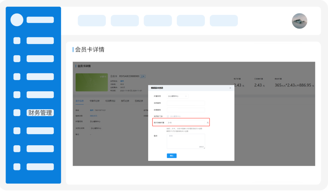 需要注意的是,场馆在使用这一功能前,需要在会员卡设置里填写折算金额,比如年卡、月卡等期限卡填写“每天消费折算金额”,次卡则是“每次消费折算金额”,这样系统才能精确统计消费数据。