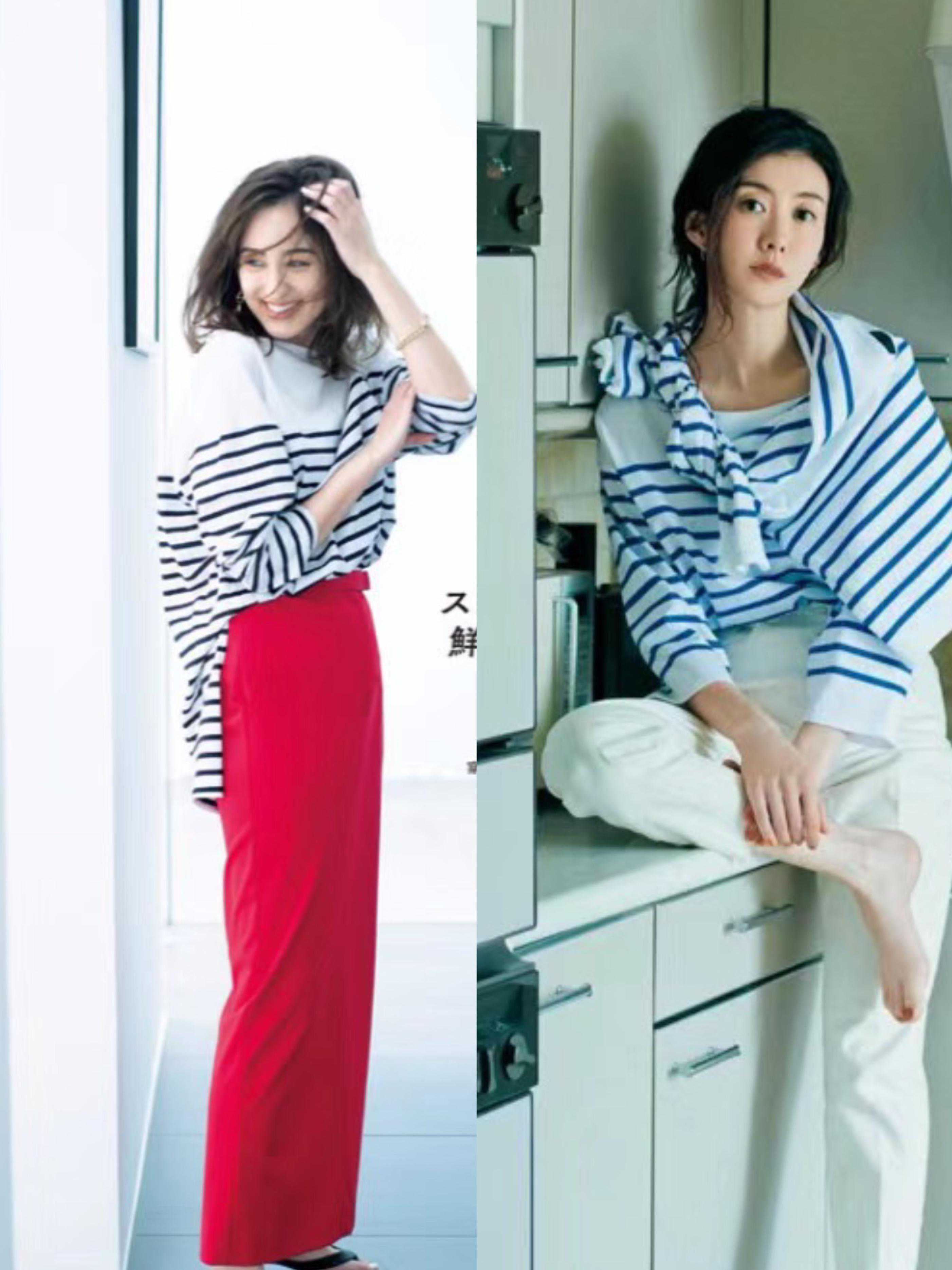 像这种蓝黑条纹的条纹衫,细腻修身的剪裁,显瘦效果就非常的强。搭配了高腰的灰色半身裙,素雅又大方。如果想要更加醒目一些,就用大色块的黑白条纹搭配红色半身裙,更加显年轻。