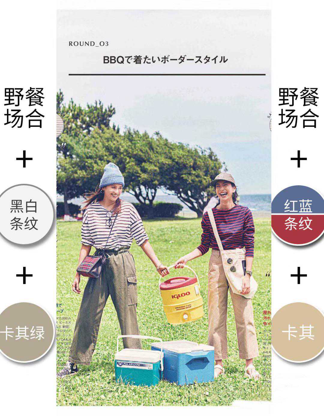 如果在秋高气爽的天气,有野餐露营的安排,一定不要忽略了条纹衫的搭配呀。经典的黑白条纹衫,选择了宽松的休闲风,搭配卡其绿的工装裤,就是又酷又美的。