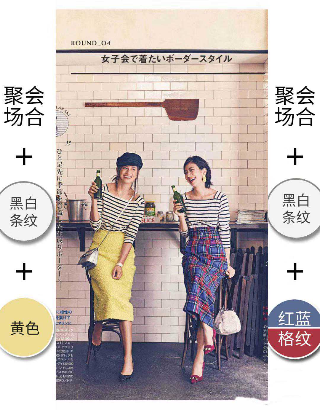 休闲聚会风的穿搭,可以更加俏皮甜美一些,在配色上也更加大胆醒目。复古的方领条纹衫,搭配了高腰的直筒半身裙,风格属性明显。