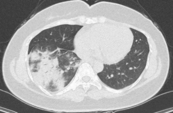 于是,朱女士来到省二医呼吸与危重症医学科门诊寻求治疗。何耀为医师通过胸部CT检查,发现她的右肺下叶有感染性病变,于是将其收治住院,进一步完善检查。