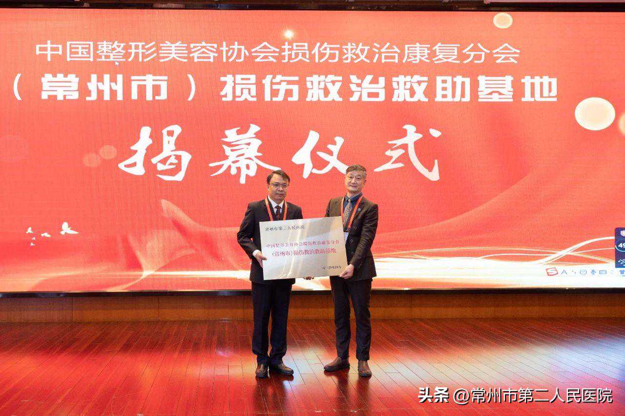 吴晓军为中国整形美容协会损伤救治康复分会(常州市)损伤救治救助基地授牌。常州二院医务科副主任周承代表常州二院接受授牌。