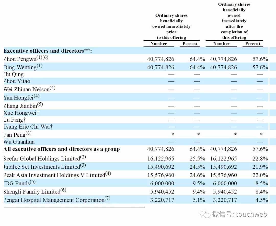IPO前,整形美容医生周鹏武持股为64.4%,IDG持股9.5%;IPO后,周鹏武持股为57.6%,IDG持股为8.5%。