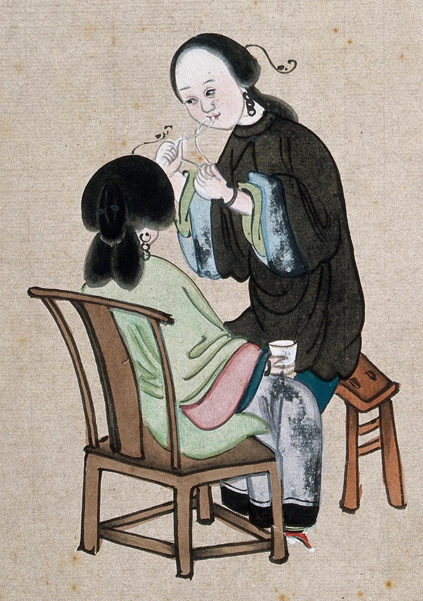 上图是十八世纪或十九世纪的外销画,题为「交面」,实际应为「绞面」——在不同的书籍和资料中,又有称之为「绞脸」、「纹脸」、「开面」、「开脸」等等名称的。其目的是借用细线或绳等,除去女子脸颊和脖子上的汗毛,使其变得光滑、白净。