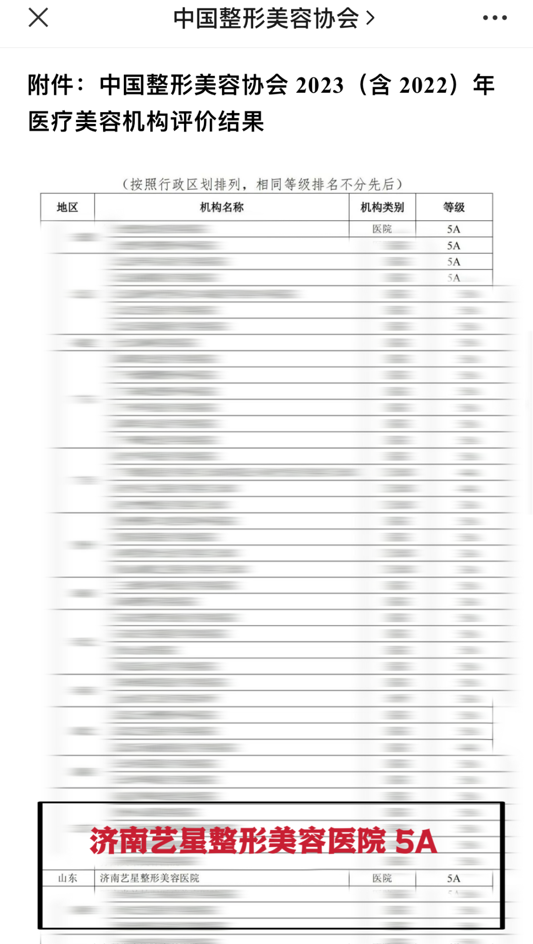 2023年12月5日,中国整形美容协会正式公布了2023年医疗美容机构评价结果,济南艺星整形美容医院获评5A,跻身中国医疗美容机构最高等级梯队并成为2023年度山东省唯一5A级医美机构。
