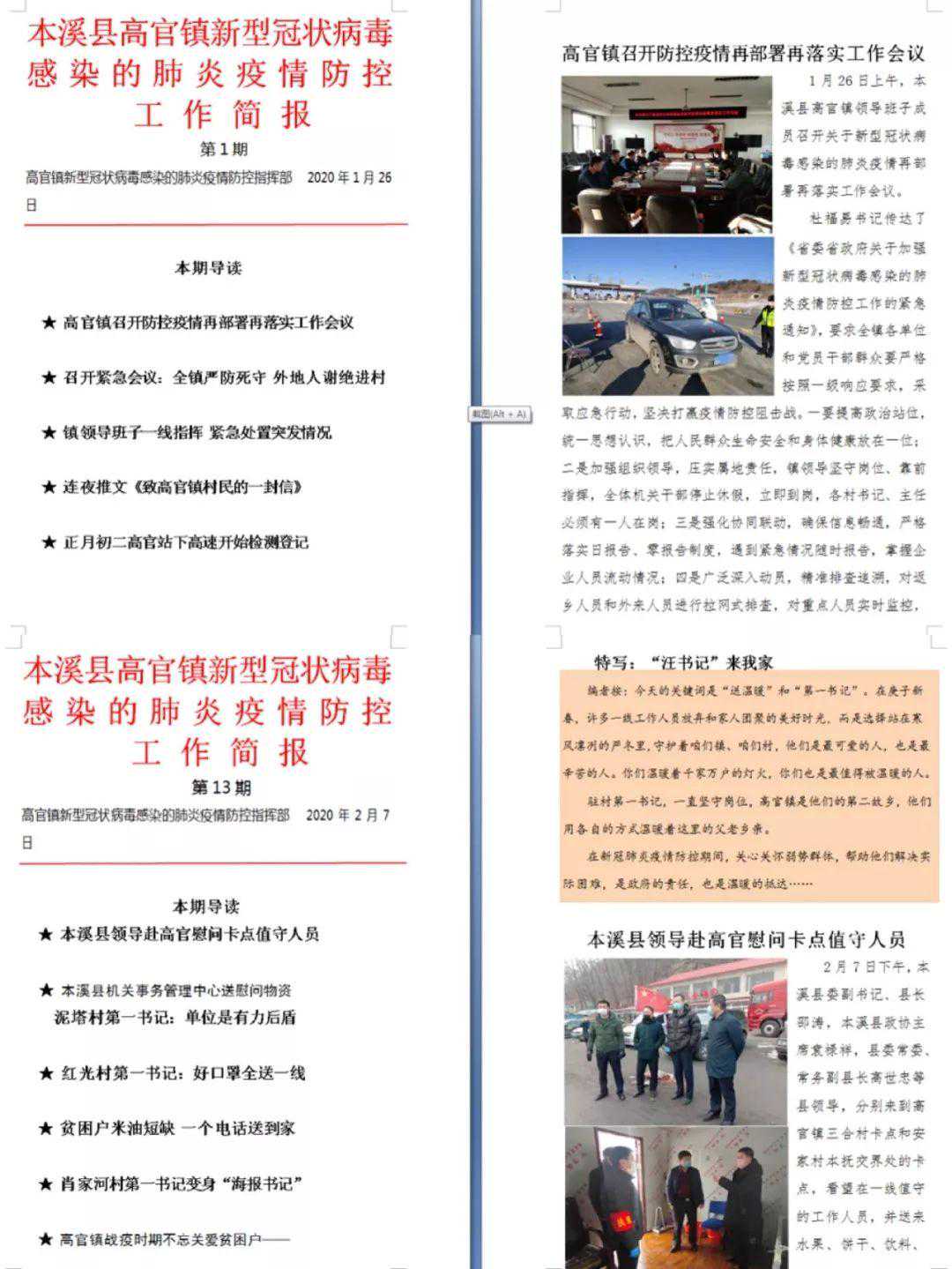 为了更全面记录高官镇防疫指挥部面对突如其来的靠前指挥和快速反应,更全面地记录高官镇党员干部群众誓死守护家园的决心,同时为了更全面地留存这次防控疫情的工作资料,周晓楠每天收集整理各方面信息,自采自编《本溪县高官镇新型冠状病毒感染的肺炎疫情防控工作简报》,从1月26日开始,每天一期,从未间断。