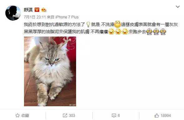 前几天,她再次发文,强调自己终于找到了对抗过敏的好方法——“不洗澡。这样皮肤表面就会有层灰黑厚厚的油脂泥,来保护肌肤”。