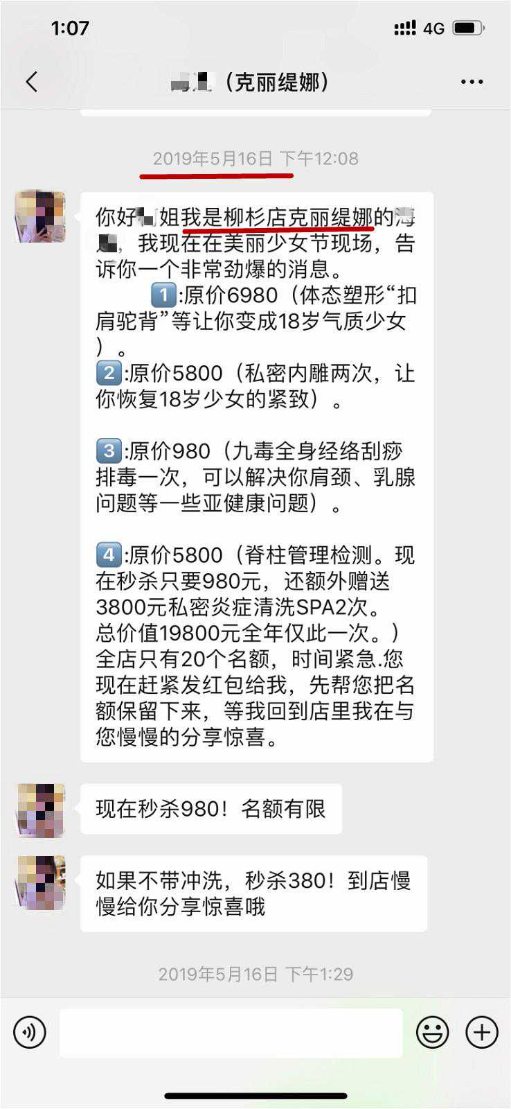 2019年5月中旬的一天,闻女士接到该“克丽缇娜”店长张某非常劲爆的消息:包括体态塑形、私密内雕等总价19800元的项目,现只要980元,全年仅此一次,全店仅20个名额。“时间紧急,您现在赶紧发红包给我,先帮您把名额保留下来。”闻女士随即照办。由于同年6月闻女士怀孕了,相关项目并未兑现。