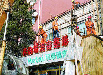 上午9点多,工程车已经到位,工作人员从二楼楼顶的广告牌匾拆起,将美容院的大红广告字一个个拆下来。