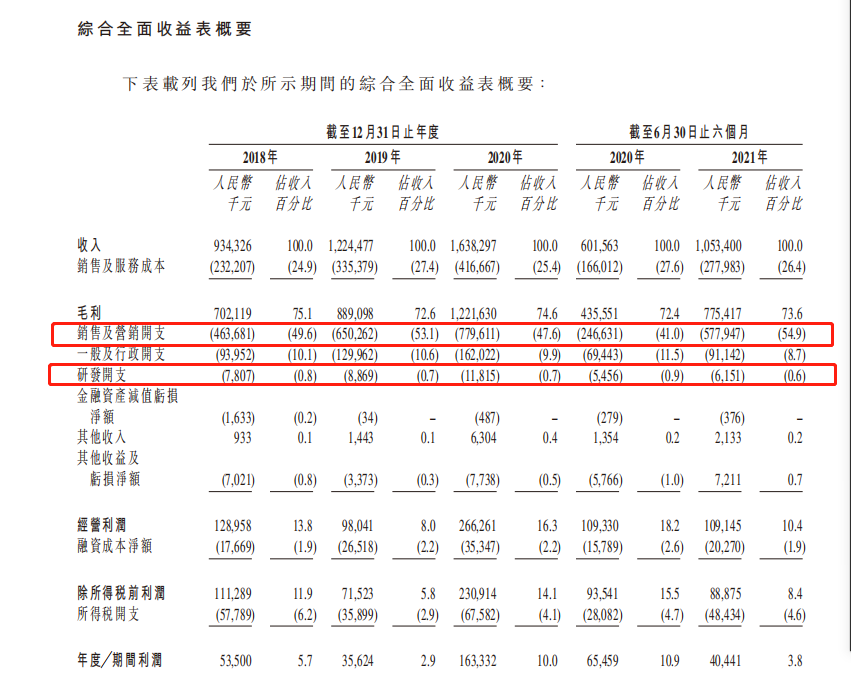 值得一提的是,与销售及营销的高支出相比,报告期内,雍禾植发研发开支仅为780.7万元、886.9万元、1181.5万元及615.1万元,占比仅为0.8%、0.7%、0.7%和0.6%。