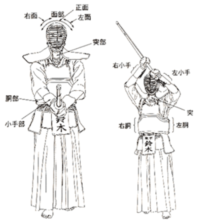 那么剑道到底是怎么比打的呢?笔者简单说一下规则。两名选手一对一比赛,手持竹刀,攻击对方指定位置,也就是有效打击部位,包括面部、躯干(酮部)、前臂(小手)和颈部(突部),其他地方打了也不得分,打的不适当还会犯规。击打时必须击打准确、富有气势、姿势合规,击打后应对对方还击状态得当、有效。