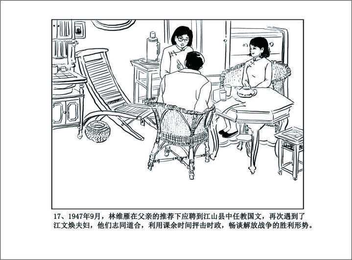 1947年9月,林维雁在父亲的举荐下应聘到江山县中任教国文,与毕业于重庆女子师大外语系的程正迦不期而遇,程夫江文焕也来江中任教英语。他们都是衢州中学同学,也是同乡。江文焕在抗战期间是西南联大闻一多、吴晗(解放初北京市副市长)的高足,曾通过秘密渠道阅读了不少马列和毛泽东著作,一心向往“跑西北走陕北”的生活。抗战胜利后,江文焕复员分配到北京大学继续攻读西语系,是“抗暴斗争”的发起者和组织者。在“五·二О运动”中担任《罢课委员会通讯》的编辑,当时已准备携妻、子进入解放区,无奈肺病复发,只得南下依靠妻子的微薄收入养家糊口、吃药治病。他们三人都是学运战线上过来的,在政治认识上志同道合。课余时间三人聚首在一起,抨击时政,畅谈解放战争的胜利形势。林维雁向程正迦、江文焕敞开心迹:在这里真闷死人了,我真想到解放区去,只是无路可循。江文焕非常同情和赞赏林维雁,几经交流,三人约定省吃俭用,一旦路资积足,立即北上寻找吴晗教授,通过秘密渠道投入到那没有阶级,没有压迫,自由幸福的革命圣地——延安。