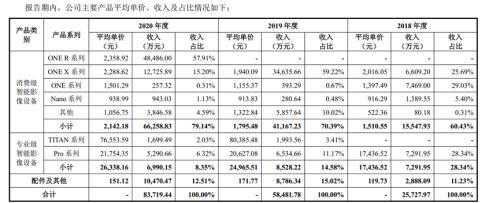 2018年主要畅销机型为ONE系列和ONEX系列,合计收入占消费级影像设备收入90.5%;2019年主要畅销机型为ONEX系列,收入占消费级影像设备收入84.1%;2020年主要畅销机型为ONER和ONEX系列,合计收入占消费级影像设备收入92.4%;