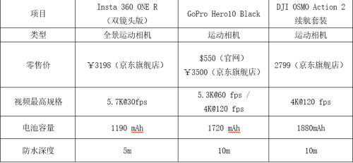 影石2020年畅销机型Insta360ONER双镜头版,相对应的,也选取GoPro的GoProHero10Black,以及大疆的DJIOSMOAction2续航套装作为对比。从技术指标上来看,横向对比下来三者并没有绝对的差异。