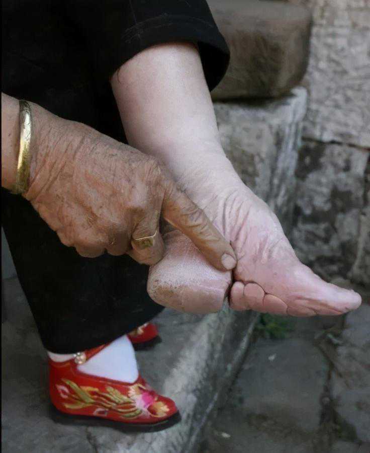 除了畸形外,因为长期用力缠裹,小脚通常颜色青紫,并不适合接触地面的脚趾关节摩擦地面,会产生大量鸡眼,导致脚部皮肤粗糙。