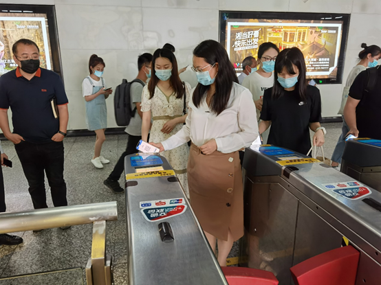 5月10日,中国银联湖南分公司主要负责人吕俐(左三)、长沙市轨道交通集团有限公司子公司湖南天闻地铁传媒有限公司金融与通讯事业部总经理董梦娣(左二)、上海璞东数字科技有限公司总裁邢泽峰(左一)在长沙市芙蓉广场地铁站共同体验长沙地铁无界联名卡乘坐地铁。摄影|王孔平