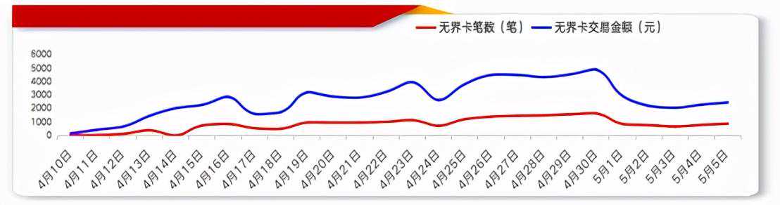 用户通过“长沙地铁”App先乘后付,刷码乘地铁、公交,使用长沙地铁无界联名卡,支付乘车款。截至2021年5月5日,长沙地铁无界联名卡发行不到一个月,日均新增达2000多张,累计发行超过12000张,日均交易笔数约1500笔(图1)。