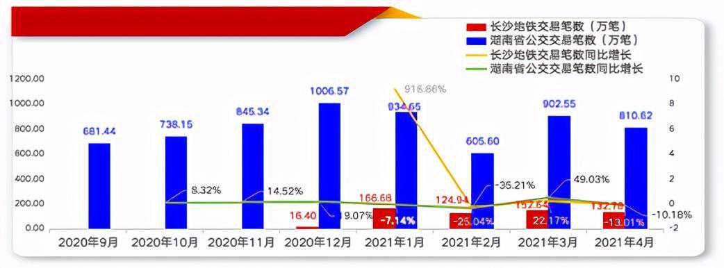 图22020年9月至2021年4月湖南省长沙地铁及全省公交银联移动支付产品交易笔数情况
