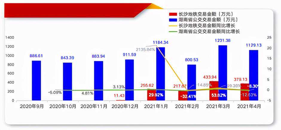 图32020年9月至2021年4月湖南省长沙地铁及全省公交银联移动支付产品交易金额情况