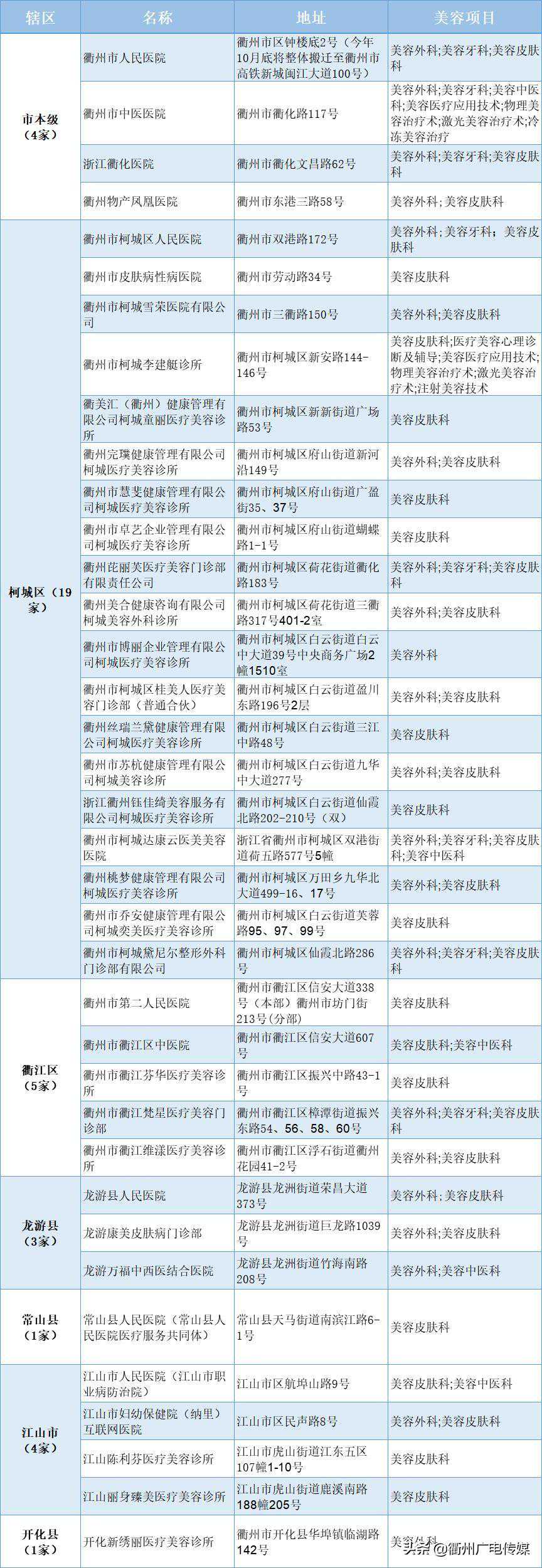 为引导广大群众到正规的医疗美容机构进行就诊,切实保障群众身体健康权益,今天,记者从衢州市卫生监督所了解到,衢州目前持有效资质且营业中的医疗美容机构共37家。