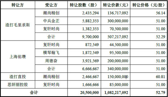 其中,渣打毛里求斯将其所持思妍丽2,435,294股、5,882,353股、1,382,353股分别以人民币136,717,092元、300,000,000元、70,500,000元转让给潮尚精创、中兵金正、复轩时尚;上海佑瓒将其所持思妍丽872,549股、1,872,549股、3,921,569股分别以人民币44,500,000元、95,500,000元、200,000,000元转让给复轩时尚、横琴翰飞、周德奋;渣打直投将其所持思妍丽2,466,667股以人民币150,000,000元转让给潮尚精创;思妍丽控股将其所持思妍丽1,666,666股以人民币85,000,000元转让给了复轩时尚。