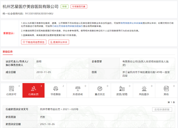 中国网财经11月8(记者杜丁见习记者安荻)信用中国显示,杭州艺星医疗美容医院有限公司新增一则行政处罚信息(杭拱市管市监处罚﹝2021﹞020号)。