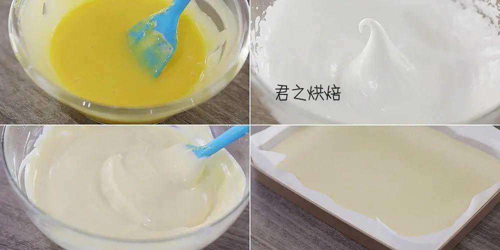 戚风蛋糕的制作方法有过很多食谱了,所以这里只简要说明一下:蛋黄蛋清分开,在蛋黄中加入糖、盐,搅打均匀,然后加入植物油和牛奶拌匀。最后将过筛的面粉加入,拌匀成为蛋黄面糊。先将1/3的蛋清和蛋黄面糊混合,再取1/3蛋清继续混合,最后将混合后的面糊倒回蛋清碗里,继续混合均匀,戚风蛋糕面糊就做好了。