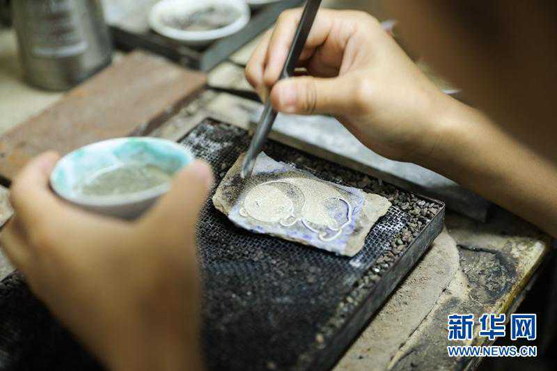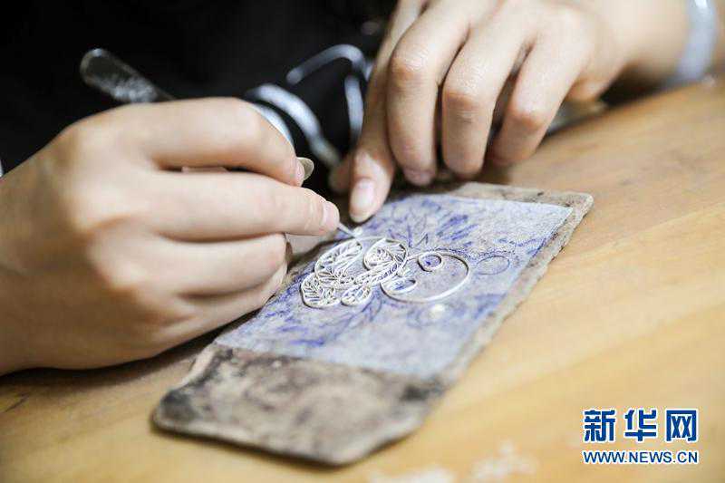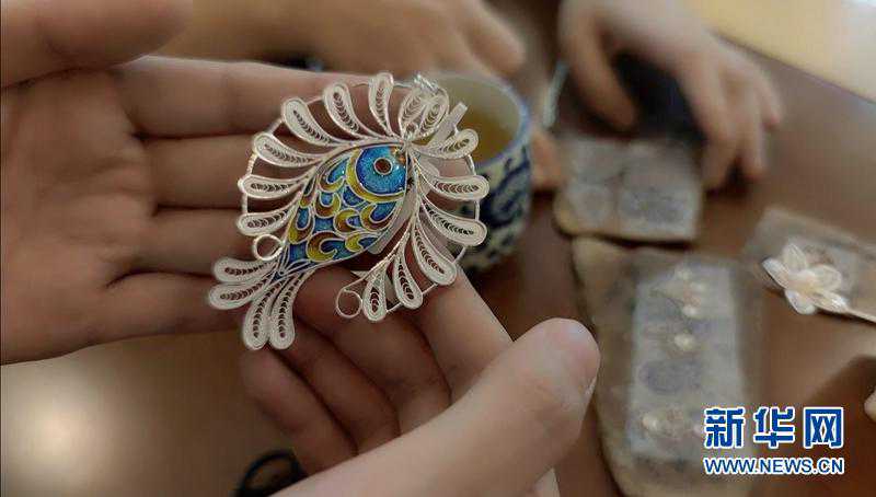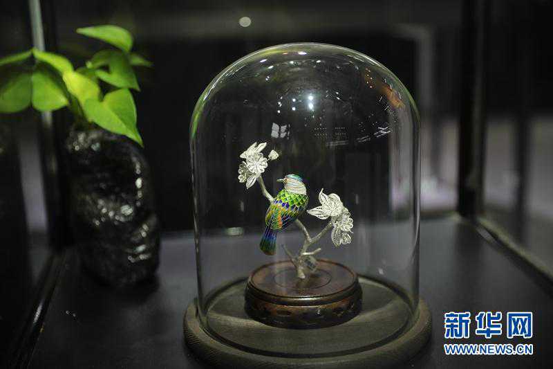 有的银花丝作品点缀有迷人的蓝,这是采用了珐琅工艺。珐琅也叫珐琅彩,又名“烧蓝”,烧制珐琅需要通过800℃左右的高温,将矿物质颜料烧熔在银花丝作品上。珐琅的加入,凸显了银的素洁莹润,让银花丝作品显得更加生动活泼、时尚大气。(资料图胥冰洁摄)