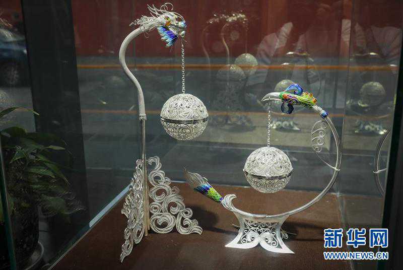银花丝的制作工序非常复杂,需经历银材料提纯、拉丝、搓丝、配丝、掐丝、填丝、垒丝、焊接、洗色等数十道工序,概括来说主要有四大环节:银锭拉制银丝—平填花丝制作——高温焊接——化学处理。“这当中还涉及到化学、冶金、机械加工等多方面知识。”王晓璐说,“目前能掌握银花丝制作全流程的人寥寥无几,我母亲道安是其中一位。”图为道安设计的作品龙凤香熏球。