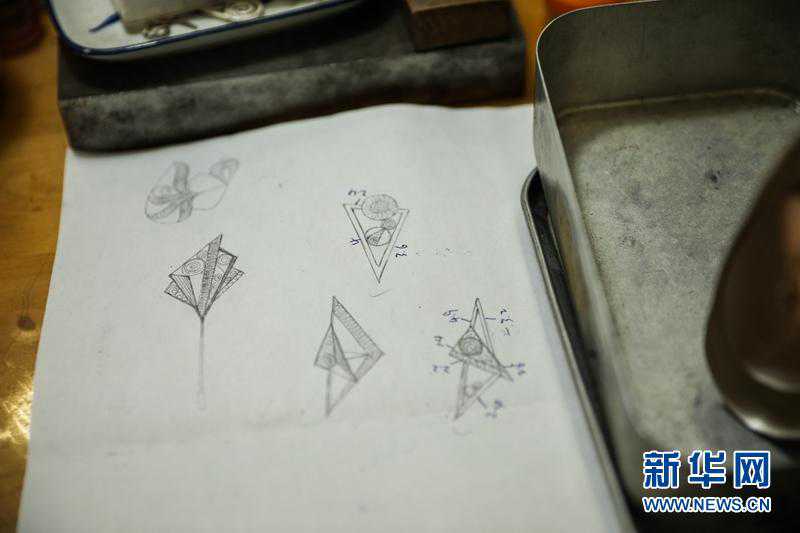 设计专业出身的王晓璐,目前主要负责原创首饰设计。小时候第一次看到由母亲独立制作的一幅名为《一帆风顺》的银丝画时,王晓璐被震撼了,同时她在心里种下了一颗关于银花丝的种子。王晓璐从高中开始学习绘画,大学时选择了旅游工艺品设计与制作专业,都是在为自己的“花丝细梦”做准备。图为王晓璐的设计图纸。