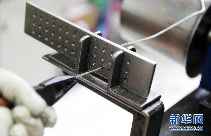 如果把银花丝制作比作刺绣,拉丝就相当于为绣娘们准备刺绣用的丝线。拉丝板上由粗到细排列着四五十个直径不同的眼孔,拉丝时必须由大到小依次通过每个眼孔,顺序不能随便跳过。一根一米长的筷子粗细的银条,通过100多道工序,可拉至1000米而不断,细度与头发丝差不多。(资料图,王晓璐提供)