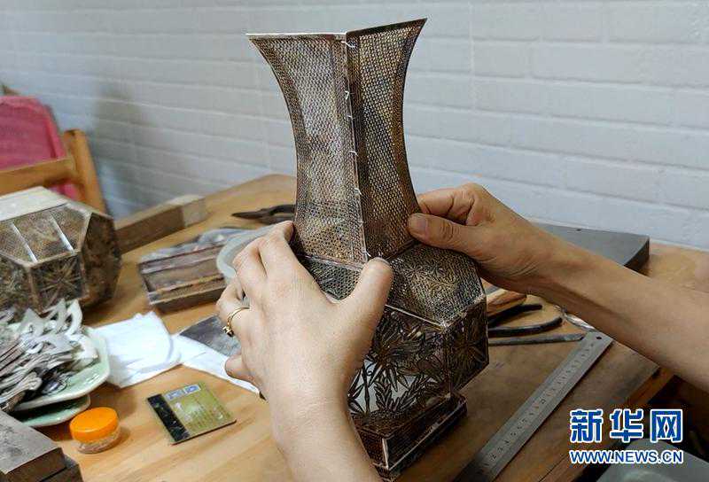 银花丝还有一项绝妙的技艺,便是无胎成型。一件立体的银花丝作品,需要由一根根银丝拼成平面,再将一个个平面组成一个立体的形状。图为制作中的花瓶。