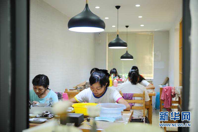 经过高温焊接后的银花丝作品,会显得“灰头土脸”,此时就需要经过化学处理,让银还原本色。随后再经过压光、防氧化等工序,才能让最终的银花丝作品“容光焕发”。图为压光工序。