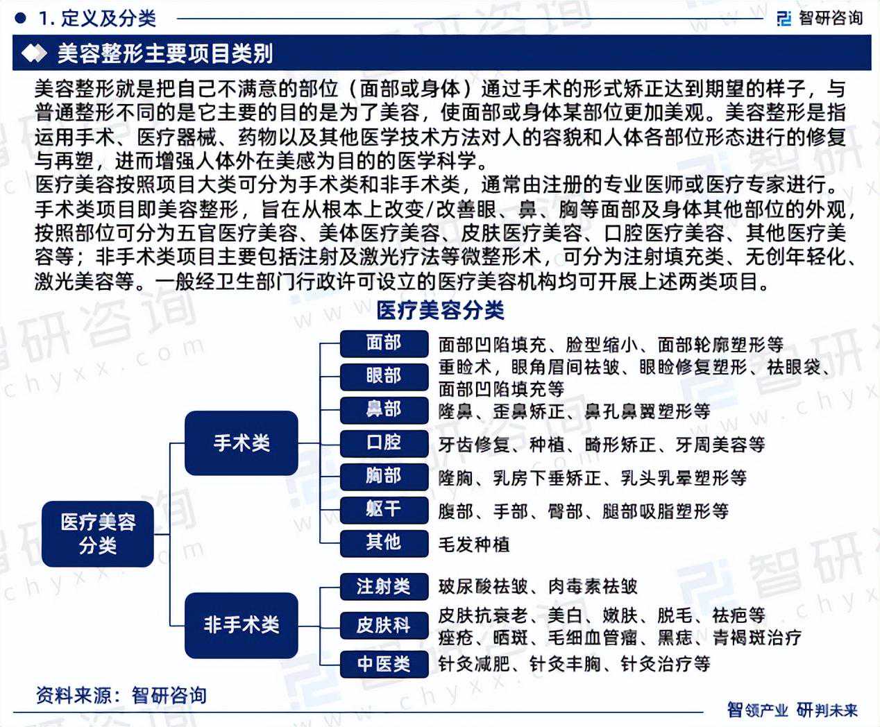 医疗美容按照项目大类可分为手术类和非手术类,通常由注册的专业医师或医疗专家进行。手术类项目即美容整形,旨在从根本上改变/改善眼、鼻、胸等面部及身体其他部位的外观,按照部位可分为五官医疗美容、美体医疗美容、皮肤医疗美容、口腔医疗美容、其他医疗美容等;非手术类项目主要包括注射及激光疗法等微整形术,可分为注射填充类、无创年轻化、激光美容等。一般经卫生部门行政许可设立的医疗美容机构均可开展上述两类项目。