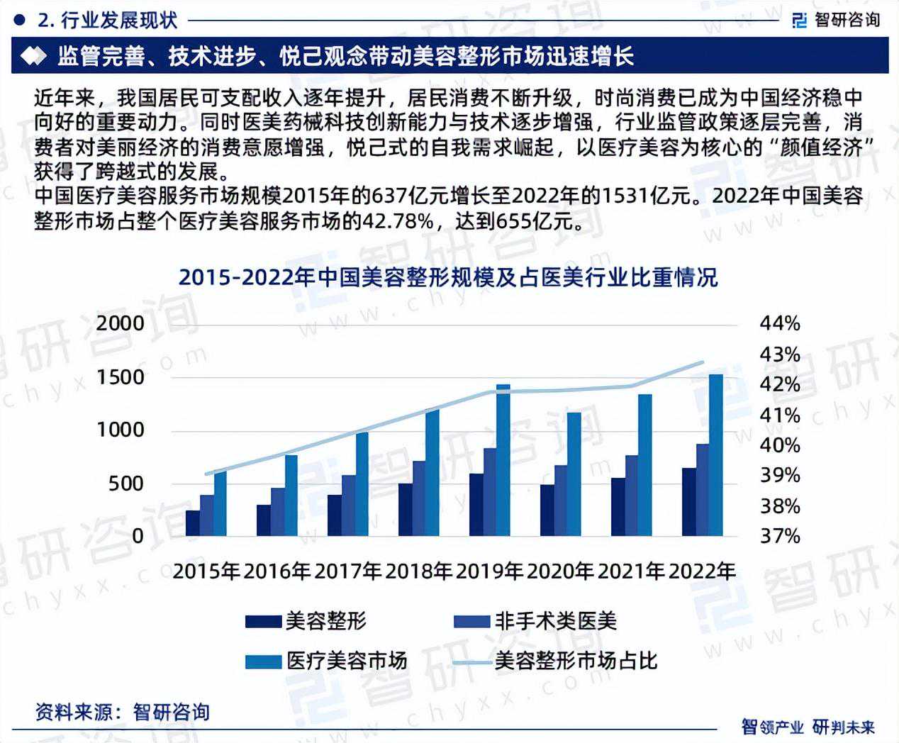 中国医疗美容服务市场规模2015年的637亿元增长至2022年的1531亿元。2022年中国美容整形市场占整个医疗美容服务市场的42.78%,达到655亿元。