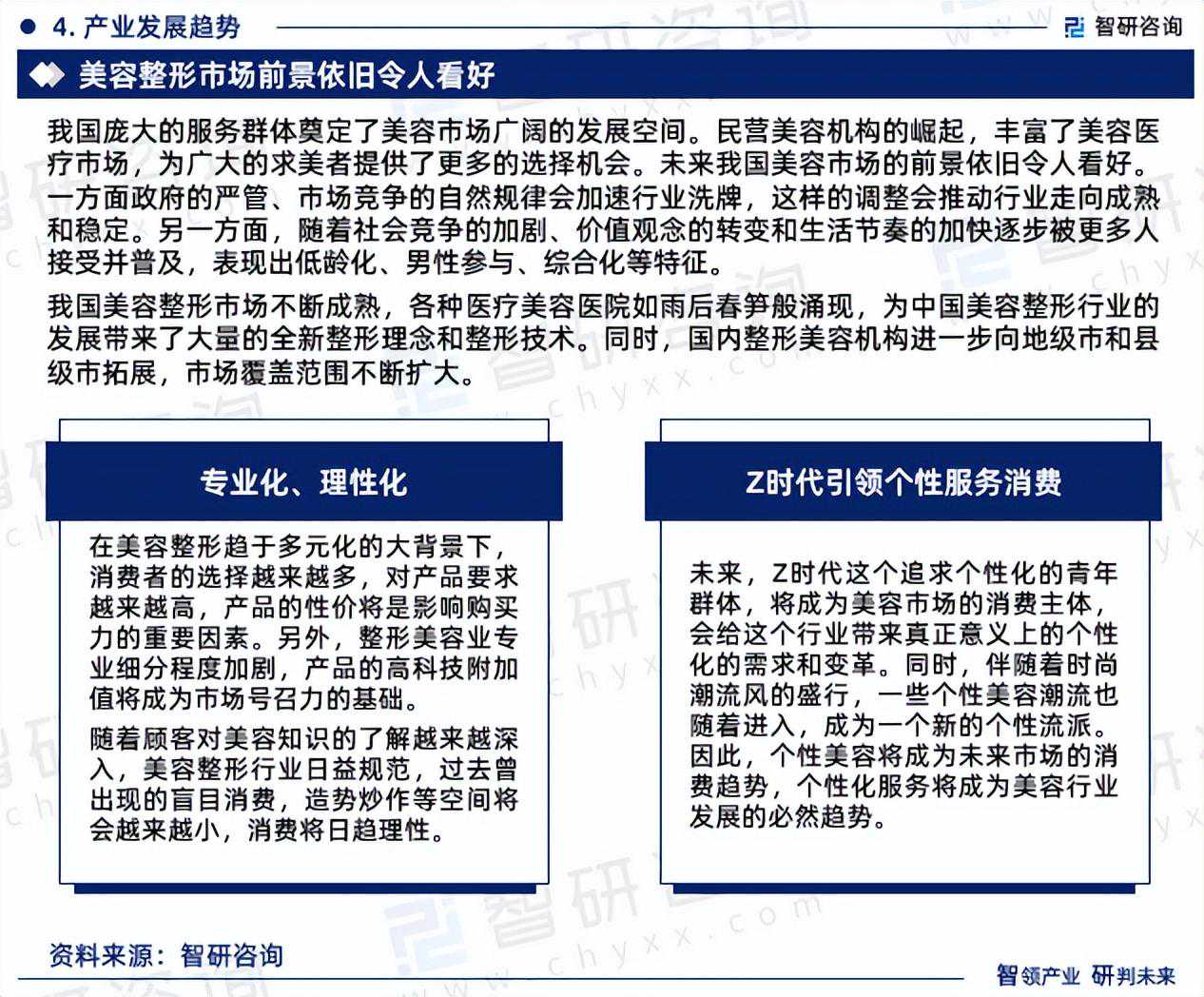 《2023-2029年中国美容整形行业竞争现状及投资策略研究报告》内容丰富、数据翔实、亮点纷呈。是智研咨询重要研究成果,是智研咨询引领行业变革、寄情行业、践行使命的有力体现,更是美容整形领域从业者把脉行业不可或缺的重要工具。智研咨询已经形成一套完整、立体的智库体系,多年来服务政府、企业、金融机构等,提供科技、咨询、教育、生态、资本等服务。