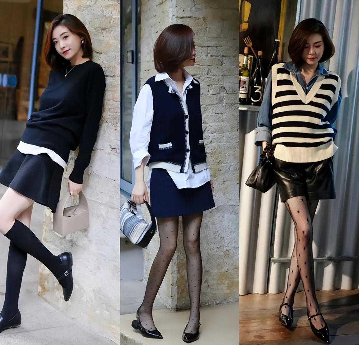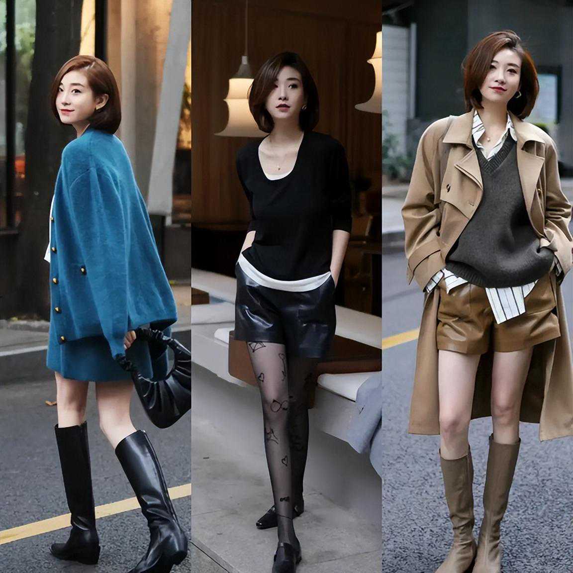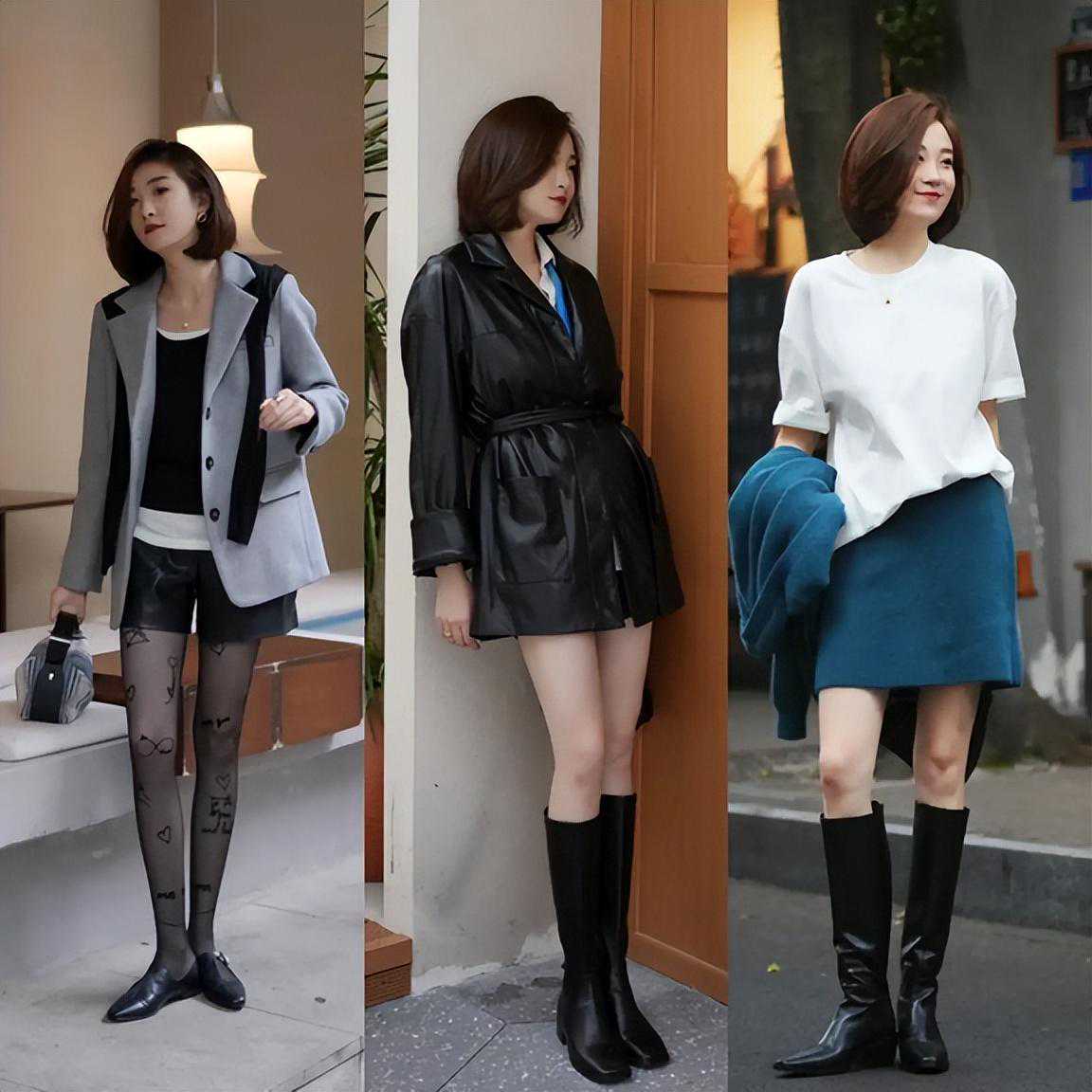 比如你们搭配这种短裙和长靴,可以露出腿的曲线,增加下半身留白,就可以制造出轻盈感。