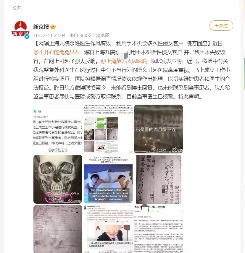据新京报2016年报道,2016年12月9日,微博名“不开心的兔兔555”发布一篇微博长文,文章指出,自己在上海第九人民医院整形时,术后存在不适反应,同时整形医生余西对其有过多次性侵行为,并在微博贴出了相关聊天记录、当事医生联络方式和录音来佐证。在12月11日,上海第九人民医院官方微博发布消息称,马上成立调查小组核实调查,涉及医生余西也已报警。2016年12月23日,“不开心的兔兔555”发布微博称之前所发微博内容系虚构,“因对手术结果不太满意而心生怨恨。”2016年12月27日,再次发微博称“余西雇佣黑客把我密码改了,还发道歉声明自己给自己道歉,我也是无语了。”2017年4月,余西离开了上海九院。
