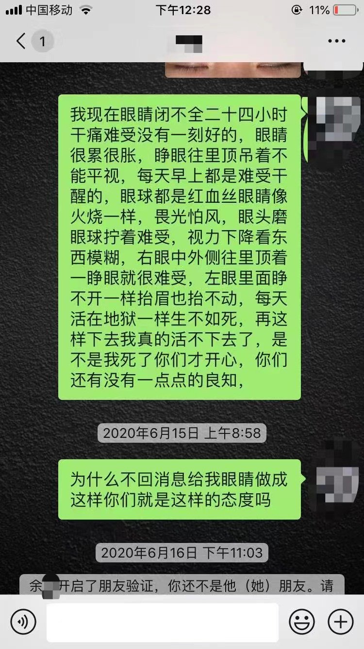王先生很焦急地联系余西的助理,“以前手术从没有出现这种情况,很害怕,好在当时已经在车上,否则眼睛看不见,打车都打不了。