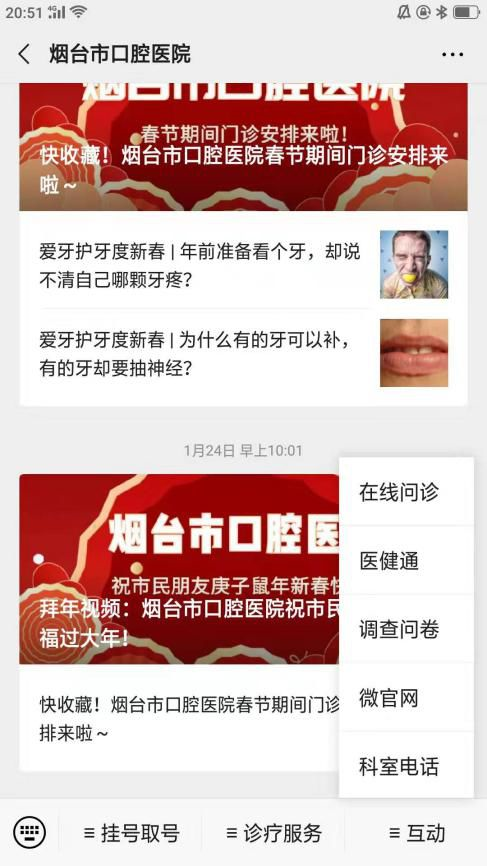 根据国务院办公厅与湖北省新型冠状病毒感染肺炎疫情防控指挥部有关通知精神,为加强新型冠状病毒感染的肺炎疫情防控工作,有效减少人员聚集,阻断疫情传播,更好保障人民群众生命和身体健康,更好的解答广大居家患者的口腔问题,我院于2月3日开通微信服务号【线上医生咨询】服务(免费),届时患者可以通过我院官方微信服务号进行图文两种方式线上咨询。