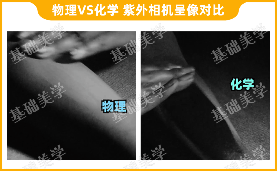 2.防晒原理物理防晒剂通过反射或散射紫外线来防晒,在紫外相机的呈现是灰色。如果不被蹭掉的话,物理防晒霜是可以持续防晒的。