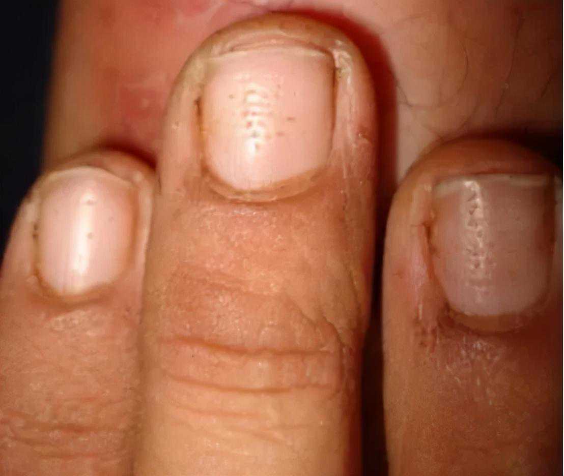 偶尔一处指甲出现少量的点状凹陷问题不大,但是如果一个指甲出现数量比较多的点状凹陷,且多个指甲都有此类问题,我们叫做顶针甲,这说明甲母质出现了问题,所以长出来的甲板都是有问题的,需要警惕潜在的皮肤疾病,最常见的是银屑病和斑秃。