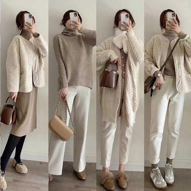 冬季的羊羔毛外套单品搭配起来也是超级温暖的,能够很好地抵御冬天的寒气。米白色系的羊羔毛外套内搭浅色系的打底衫,简约又暖和,非常抗风,而且这样的冬季搭配也是很减龄的。