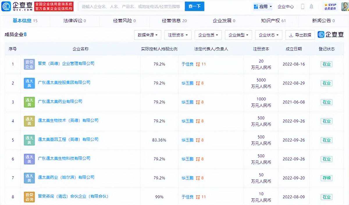 企查查APP显示,广东遇太美生物科技有限公司成立于2022年9月,法定代表人为华玉鹏,注册资本为500万元人民币,由广东遇太美控股集团有限公司全资控股。目前,广东遇太美生物科技有限公司所属集团共有8家成员企业,还包括晋荣(英德)企业管理有限公司、广东遇太美药业有限公司等,企业状态均为在业,实际控制人为于佳良。