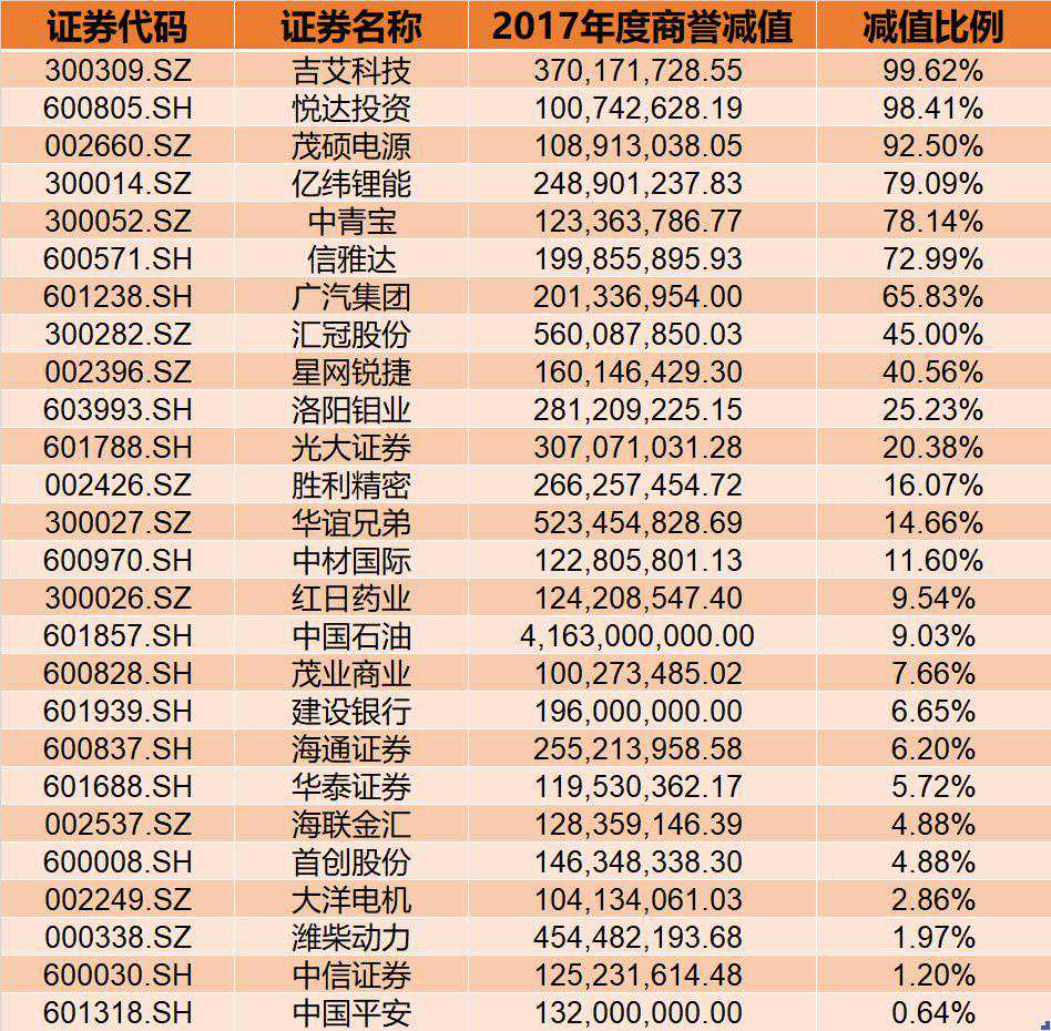 有媒体整理出上市公司在2017年因商誉减值造成的损失排名。