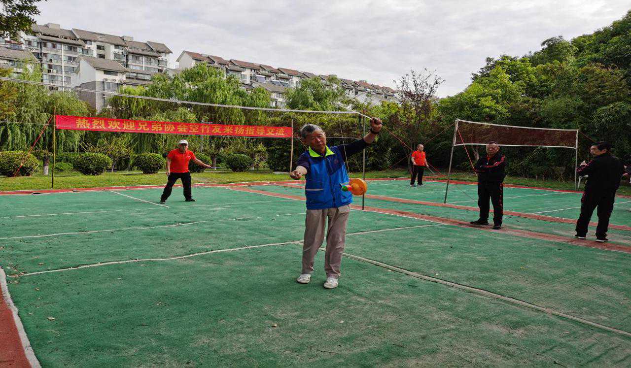 刘荣根(左二)与来扬州漕河空竹(球)培训基地学习的泰州空竹球友交流