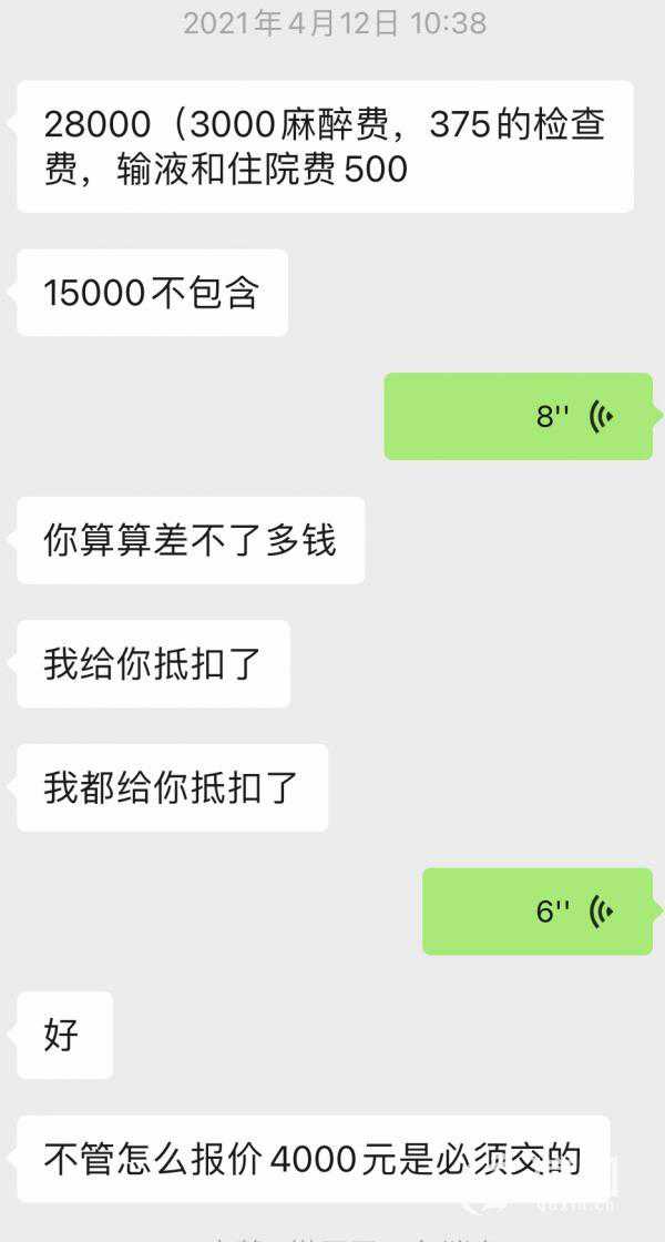 让张女士没想到的是,在她询问交费明细时,壹美天成整形并未提供。“根据当时官女士给我的报价,只做吸脂是1.9万元,吸脂加填充一起做是2.8万元,因此我推测面部填充的单价在1万元左右。”张女士就此事微信咨询了自称壹美天成整形咨询部的经理赵先生,至今也未给处理结果。